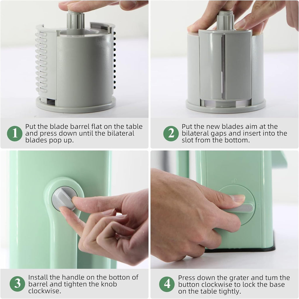 - 【Quick Spin & Quick Clean】: Our rotary grater the handle is designed as a spiral structure is more efficient, cutting potatoes, radishes, onions, carrots, garlic, cheese and so on quickly like a storm!15x faster than other cheese shredders. It' s also easy to install and remove, just rinse it under running water after use, and the included small brush can help you clean any gaps.